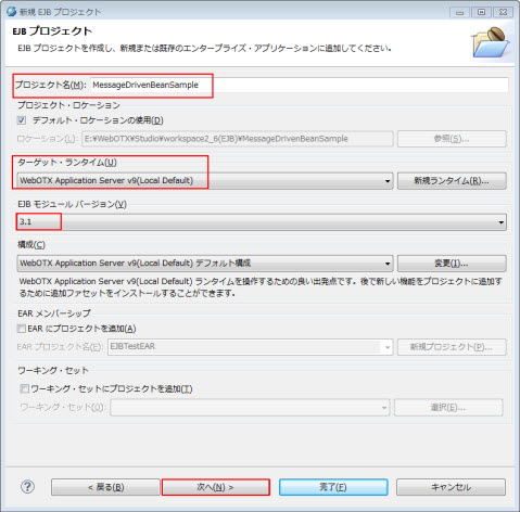 プロジェクト名に作成するプロジェクト名MessageDrivenBeanSampleを入力して、ターゲット・ランタイムにWebOTX Application Server v10.2(Local Default)を選択します。 次へ をクリックします。