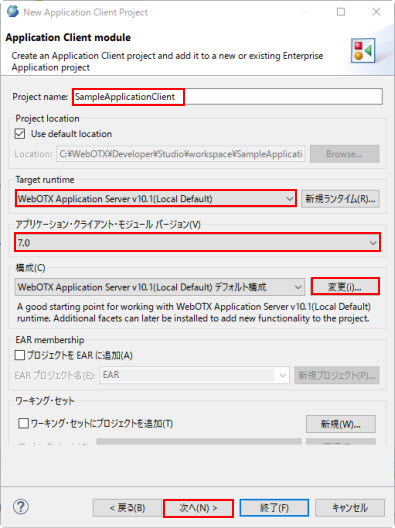 ターゲット・ランタイム でWebOTX Application Server v10.2(Local Default)を選択します。