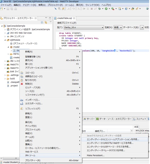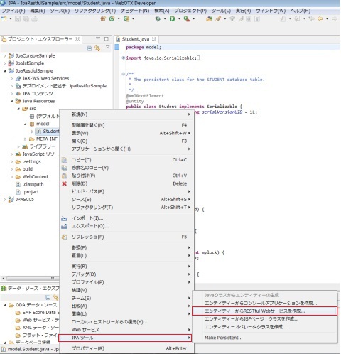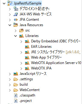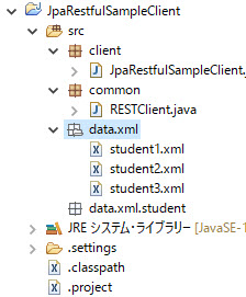<?xml version="1.0" encoding="UTF-8" standalone="yes" ?> <student> <id>60</id> <mylock>30</mylock> <name>Akasha</name> <sport>Pain</sport> </student>作成完了のJpaRestfulSampleClientプロジェクトは以下のようです。