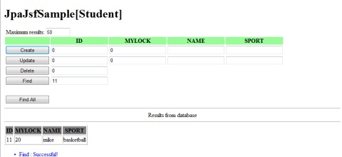 result(id=100):<?xml version="1.0" encoding="UTF-8" standalone="yes"?><student><id>100</id><mylock>10</mylock><name>WangHaidong</name><sport>BasketBall</sport></student> After Create(id=40,id=60), result(all):<?xml version="1.0" encoding="UTF-8" standalone="yes"?><students><student><id>100</id><mylock>10</mylock><name>WangHaidong</name><sport>BasketBall</sport></student><student><id>40</id><mylock>20</mylock><name>Shirley</name><sport>Dance</sport></student><student><id>60</id><mylock>30</mylock><name>Akasha</name><sport>Pain</sport></student></students> After Update(id=40), result(all):<?xml version="1.0" encoding="UTF-8" standalone="yes"?><students><student><id>100</id><mylock>10</mylock><name>WangHaidong</name><sport>BasketBall</sport></student><student><id>40</id><mylock>30</mylock><name>Valentine</name><sport>CQB</sport></student><student><id>60</id><mylock>30</mylock><name>Akasha</name><sport>Pain</sport></student></students> result(0~1):<?xml version="1.0" encoding="UTF-8" standalone="yes"?><students><student><id>100</id><mylock>10</mylock><name>WangHaidong</name><sport>BasketBall</sport></student><student><id>40</id><mylock>30</mylock><name>Valentine</name><sport>CQB</sport></student></students> After Delete(id=40,id=60), result(all):<?xml version="1.0" encoding="UTF-8" standalone="yes"?><students><student><id>100</id><mylock>10</mylock><name>WangHaidong</name><sport>BasketBall</sport></students> succeed