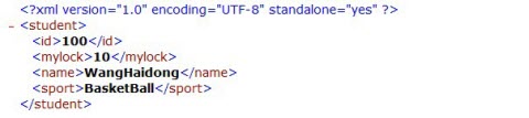 <?xml version="1.0" encoding="UTF-8" standalone="yes" ?> <student> <id>40</id> <mylock>20</mylock> <name>Shirley</name> <sport>Dance</sport> </student>student2.xmlというxmlファイルを作成し、その内容は以下ようにします。