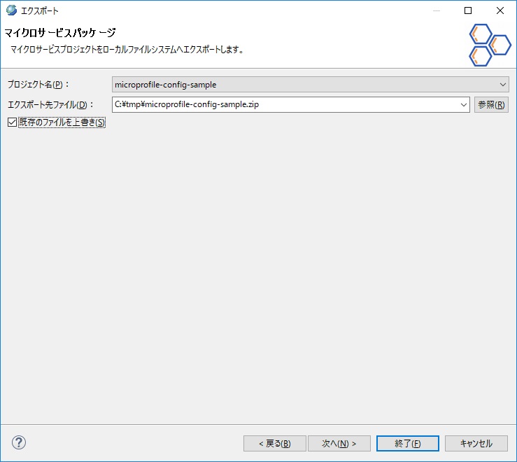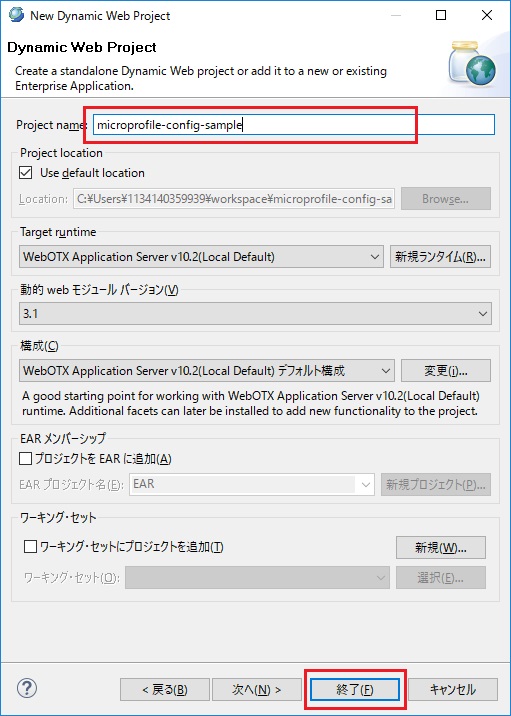 プロジェクト名を「micorprofile-config-sample」と入力し、「終了」ボタンをクリックします。