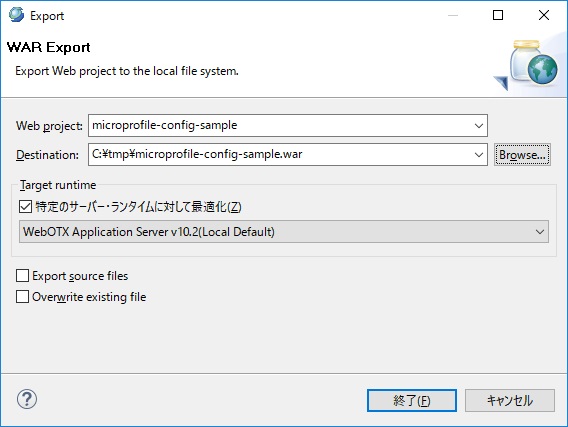 また、「アプリケーション(warファイル)」の「追加」ボタンで (6) でエクスポートした war ファイルを指定して、 「終了」ボタンをクリックします。