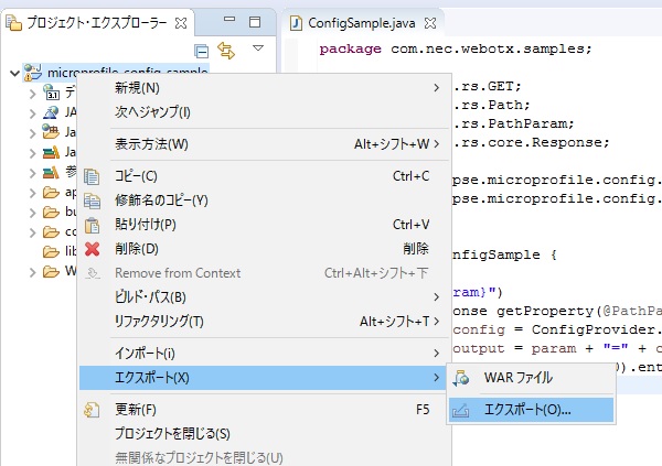 プロジェクトを右クリックして、「エクスポート」−「WAR ファイル」を選択します。