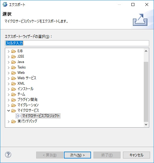 エクスポートウィンドウが起動するので、「マイクロサービス」−「マイクロサービスプロジェクト」を選択し、「次へ」ボタンをクリックします。