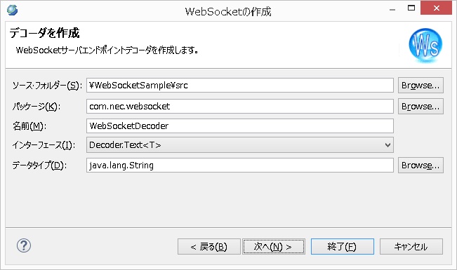 | ソース・フォルダー | WebSocketデコーダクラスのソースフォルダーを指定します。 | 選択されるソースフォルダー |