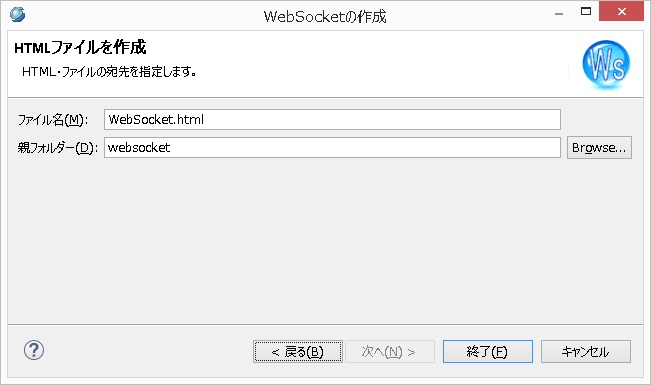 HTMLファイルのフォルダーを指定します。 指定するのは、WebプロジェクトのWebContentフォルダからの相対パスです。 例えば、「websocket」を指定する場合、プロジェクトのWebContent/websocketフォルダーにHTMLファイルが生成されます。 何も指定しない場合、WebContent直下に生成します。 |