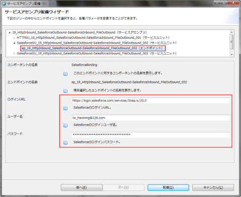 otxadmin> deploy-jbi-service-assembly --apgroup <アプリケーショングループ名> --pgroup <プロセスグループ名> <19_Salesforce.zipへのパス>ただしポート、ディレクトリパスまたはログイン情報が適切ではない場合はmodifyオプションをtrueにし、SalesforceSU、FILESUとHTTPSUを修正してください。