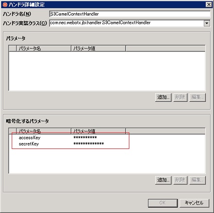 otxadmin> set server.jbi.components.TransportBinding.service-units.TransportSU_25_FileInbound_TransportOutbound_002.endpoints.ep_25_FileInbound_TransportOutbound_002#Provider.EncryptedHandlerProperties={{secretKey,[シークレットキー]},{accessKey,[アクセスキー]}
