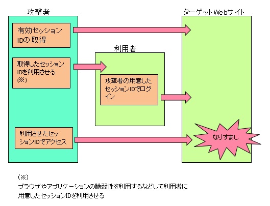 攻撃者がターゲットWebサイトから有効セッションIDを取得し、何らかの方法で利用者に利用させることで セッションIDと利用者のログイン情報を結びつけさせます。攻撃者はそのセッションID を用いてターゲットWebサイトにアクセスすることで利用者になりすます事が可能になります。