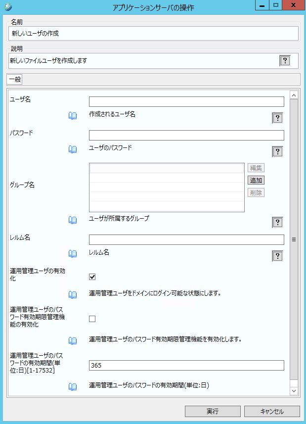 [アプリケーションサーバの操作]画面に、作成するユーザのユーザ名、グループ名、パスワード、レルム名を入力してください。ユーザアプリケーションで使用している