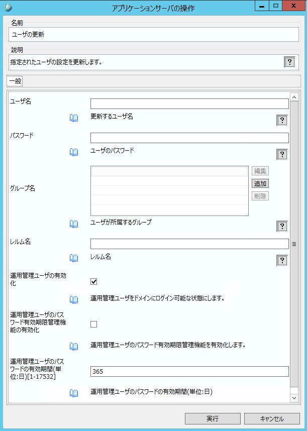 [アプリケーションサーバの操作]画面に、更新するユーザのユーザ名、グループ名、パスワード、レルム名を入力してください。ユーザアプリケーションで使用しているレルム名は[ドメイン名]-[アプリケーションサーバ]-[セキュリティーサービス]-[デフォルトレルム]で確認できます。運用管理ユーザで使用するレルム名はadmin-realmです。