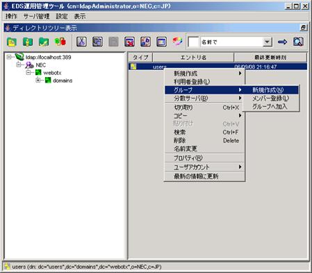 EDSにユーザを追加、削除する方法はEDSの運用管理ツールから行うか、EDSのedloadコマンドを利用し、ldifファイルを読み込む方法があります。edloadコマンドを利用してユーザの追加、削除を行う方法については、EDSのマニュアル(ユーティリティ利用の手引1章)を参照してください。今回、運用管理ツールから追加を行う方法について説明します。