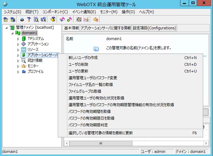 2. [ドメイン名]-[アプリケーションサーバ]を右クリックし、[運用管理ユーザのパスワードの有効期限管理機能の有効化状態を取得]を選択します。