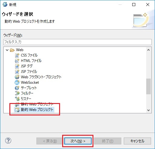 WebOTX Developer を起動し、メニューバーから「ファイル」−「新規」−「その他」を選択します。 次に、以下のようなウィンドウが開くので、「Web」−「動的 Web プロジェクト」を選択して「次へ」ボタンをクリックします。