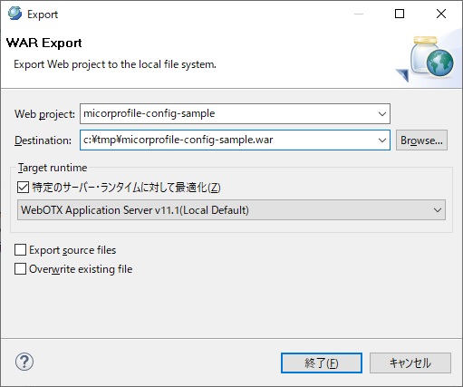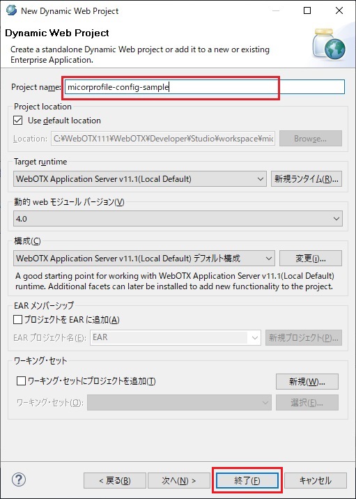 プロジェクト名を「micorprofile-config-sample」と入力し、「終了」ボタンをクリックします。