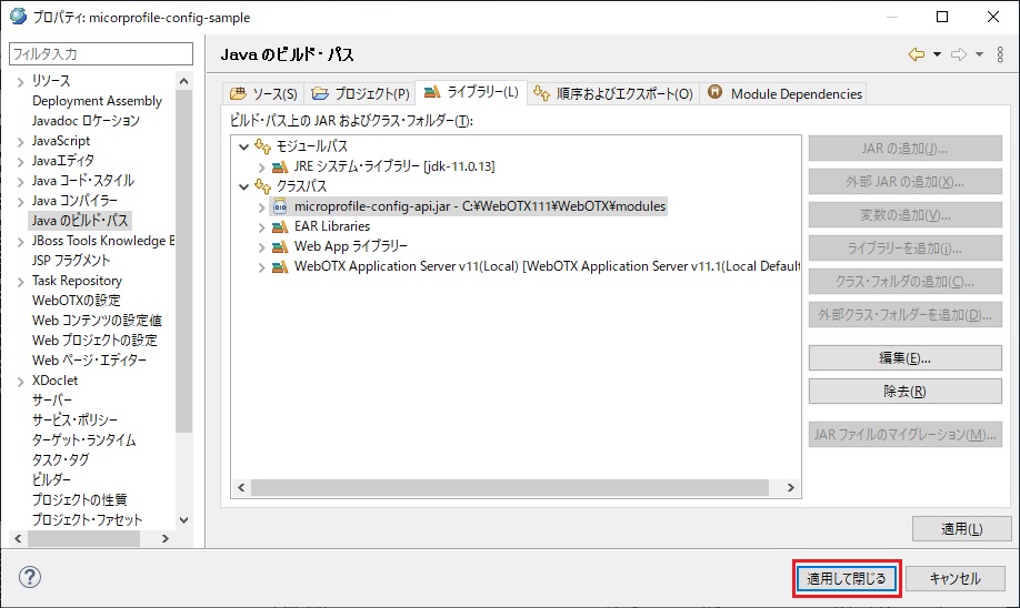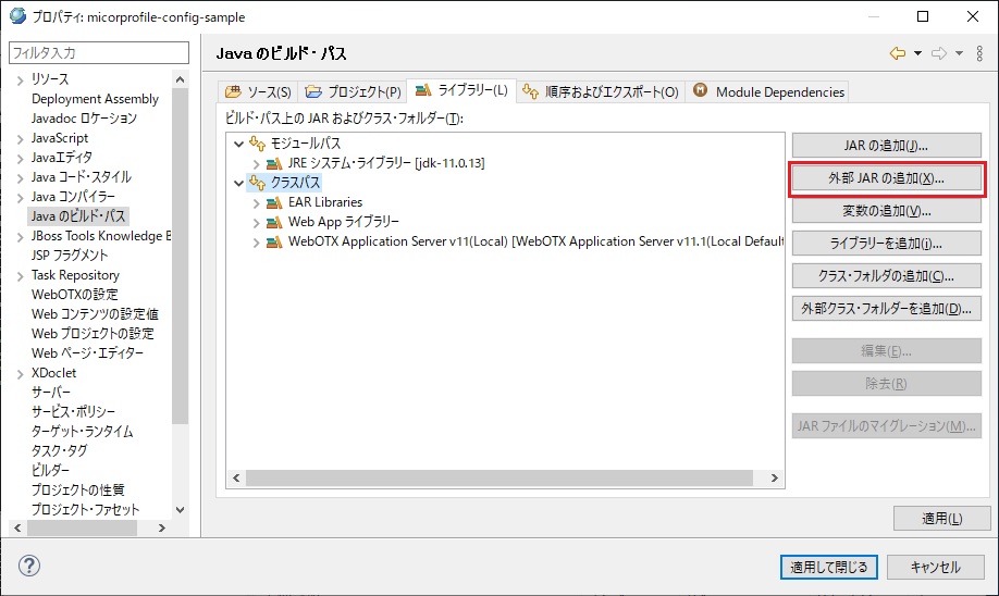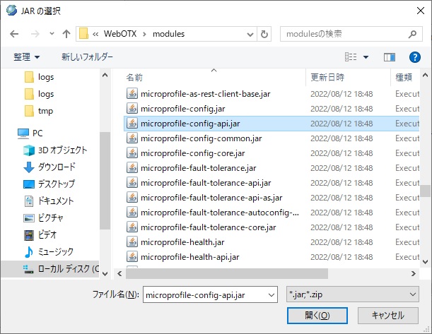 <WebOTX インストールディレクトリ>\WebOTX\modules から microprofile-config-api.jar を選択して、追加します。