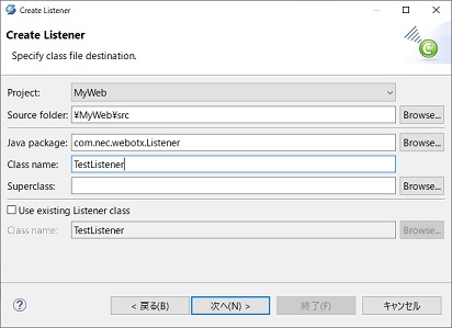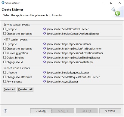 コンテキストの生成と破棄のイベントが発生したときの処理を実装します。contextInitialized(ServletContextEventsce)メソッドとcontextDestroyed(ServletContextEvent