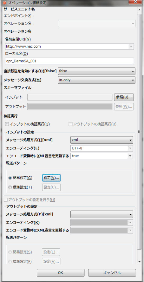 対象SUフォルダのMETA-INFフォルダのschemaフォルダ配下にあるスキーマファイルの相対パスを指定します。 指定したスキーマファイルは、後述のインプット検証/アウトプット検証を選択することで実行時のメッセージ検証に利用することができます。 選択しなかった場合も、XSLT SE による変換の定義の際のインプット/アウトプットスキーマとして利用することができます。 [メッセージ交換方式を指定した場合のみ設定可能] |