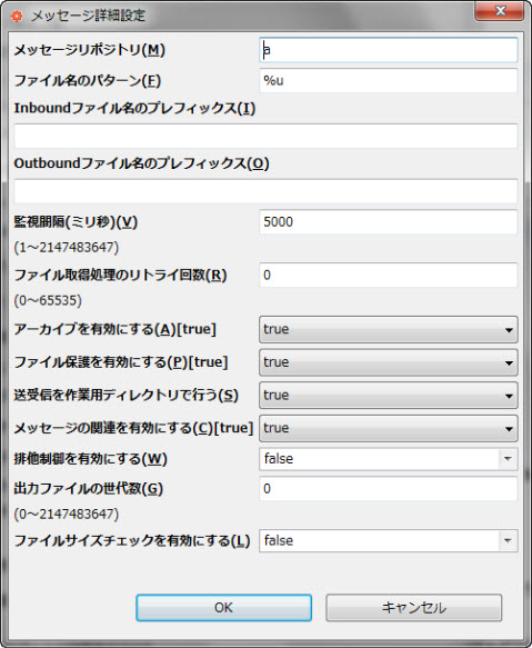 標準設定では、「送信ファイル名」と「受信ファイル名」の設定にはファイル名を含むフルパスを指定する必要があります。それぞれ「送信/受信ファイル名にパターンを有効にする」をtrueにすることで正規表現や特殊文字が使用可能になります。
