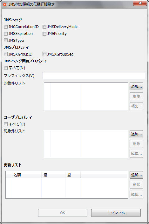 更新リストを指定します。 更新したい特定のJMSヘッダ、JMSプロパティ、JMSベンダ固有プロパティ、ユーザプロパティを指定します。 全ての設定より優先するため、伝播された情報の上書きや、伝播されていない情報の追加設定ができます。 |