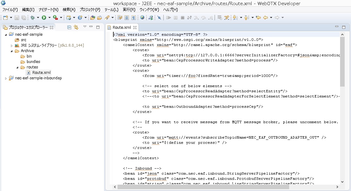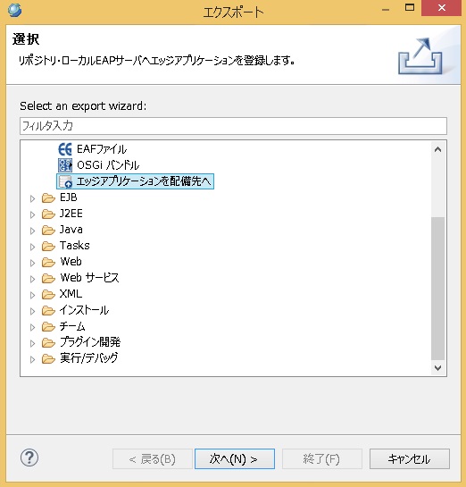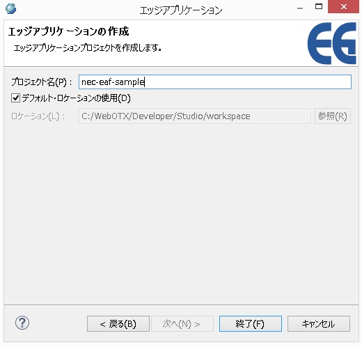 [ファイル]-[新規作成]-[プロジェクト]-[EAF]-[エッジアプリケーションプロジェクト]を選択しプロジェクト名を指定して「終了」を押下することでプロジェクトを新規作成します。