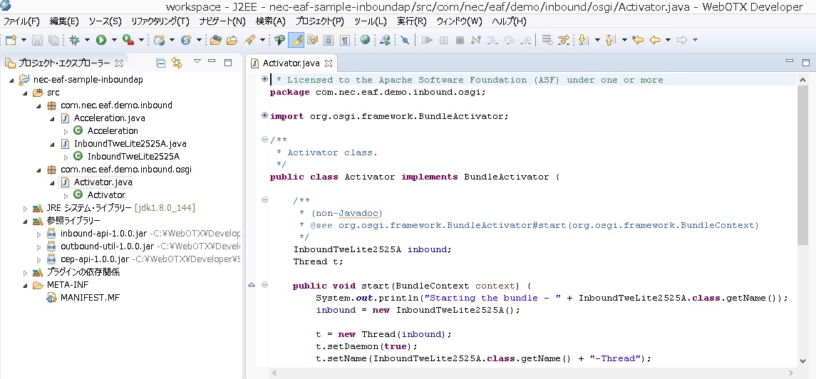 <\WebOTXインストールフォルダ>\Developer\Studio\workspace\<OSGiバンドルプロジェクト名>\src\<パッケージ名>\<Activatorのjavaファイル名>を編集します。