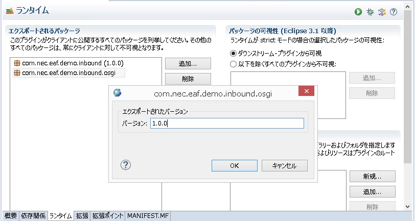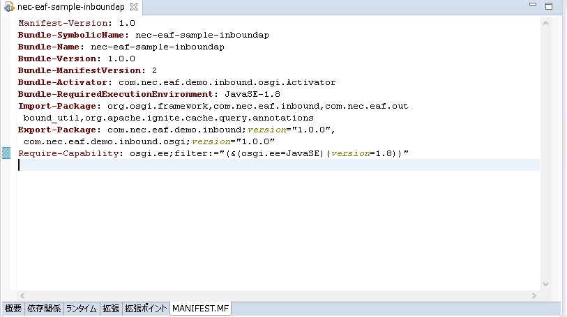 OSGiバンドルプロジェクトでは、このJavaプログラムの開発とマニフェストファイルの編集によりOSGiバンドルを作成します。
