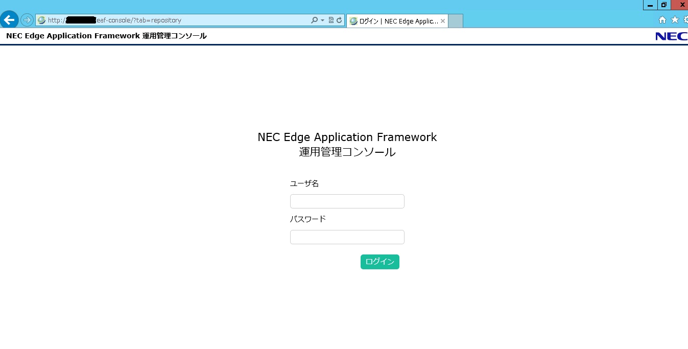 手順5. Internet Explorerで http://<ホスト名>/eaf-console/?tab=repository にアクセスし以下の EAF運用管理コンソールログイン画面 が表示されることを確認。