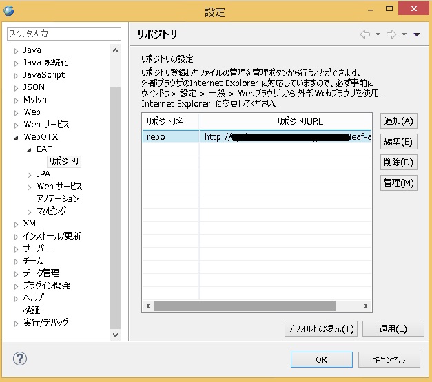 2. [ウィンドウ]-[設定]-[WebOTX]-[EAF]-[リポジトリ]を開き、[追加]ボタンを押下し名前とリポジトリ機能のURLを指定します。