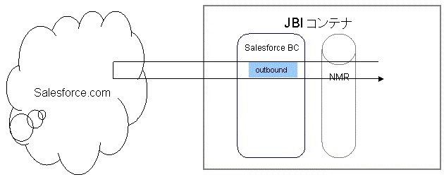 Outbound(SOAPクライアント機能)は、NMRから受信したメッセージをSOAPメッセージに変換(デノーマライズ)し、Salesforce.comへ送信します。また、Salesforce.comからのレスポンスを受け取って、そのSOAPメッセージを変換(ノーマライズ)してNMRに返却します。