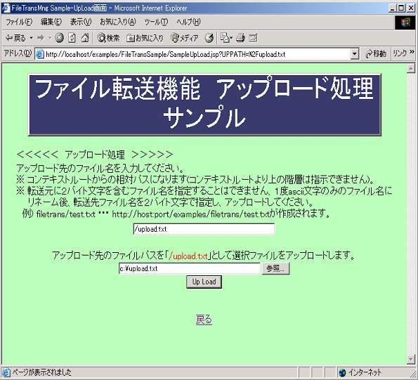 | http://Webサーバ名(ドメイン省略不可):ポート番号/FileTransSample/SampleUpLoad.jsp |