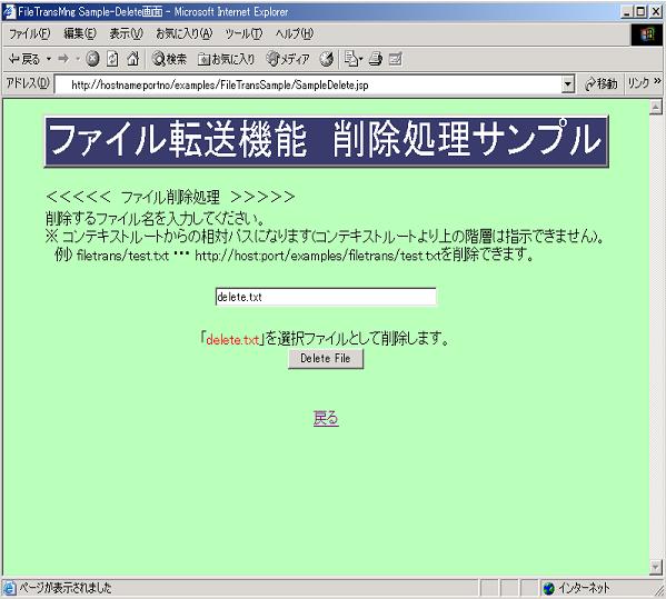 - Delete Fileボタンをクリックすると削除リクエストがサーブレット(FtransServlet.class)に送信され、ファイルが削除されます。