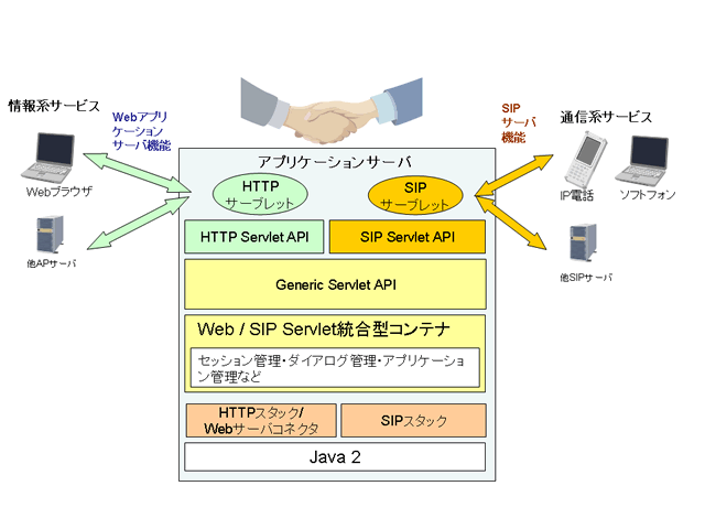 Web/SIP統合型コンテナは、SIPサーブレットの実行を可能とします。SIPサーブレットは、HTTPサーブレットの拡張として開発されたもので、HTTPサーブレットと同様のサーブレットアーキテクチャの上に実装されています。