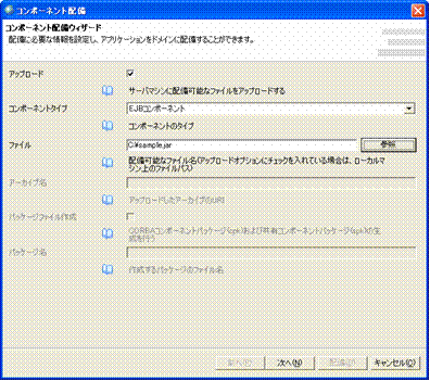 別の例を挙げると、Enterprise Editionにおいてアーカイブ名が「sample.jar」であるEJB JARを配備し、その後再配備するには、次のようにします。配備先のアプリケーショングループ名をapgで、プロセスグループ名をpgとしています。