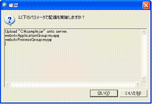 別の例を挙げると、Enterprise Editionにおいて、サーバ上でのディレクトリのフルパスが「C:\sample」であるWebアプリケーションを配備し、その後再配備するには次のようにします。配備先のアプリケーショングループ名をapgで、プロセスグループ名をpgとしています。