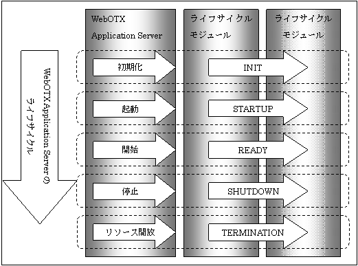 WebOTX Application Serverでは複数プロセスグループ上でライフサイクルモジュールの機能を提供するため、各プロセスグループ上からはドメインに登録されたライフサイクルモジュールの情報を参照し、設定情報を取得しています。したがって、ドメインに登録された情報への参照の有効・無効を設定することで、プロセスグループごとにライフサイクルモジュールの有効・無効を設定することができます。
