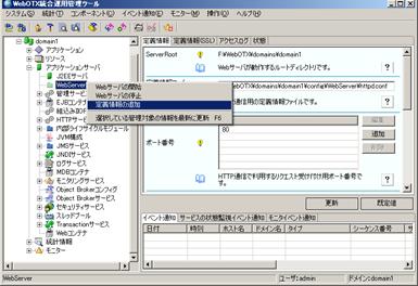 あらかじめ、統合運用管理ツールよりドメインに接続しておきます。「WebOTX 管理ドメイン[<サーバ名>]」− 「<ドメイン名>」−「アプリケーションサーバ」−「WebServer」 を選択し、マウスを右クリックして操作メニューを表示します。 あるいは、メニューバーの[操作]を選択します。