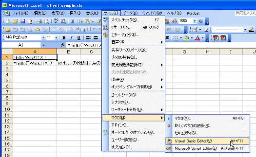 client_sample.xls -WebサービスにアクセスするExcelファイル本体です。コードはVBAで記述されています。セキュリティの設定レベルが高いとサンプルが実行できませんので、セキュリティレベルを下げるかアプリケーション開発ガイドを参照してExcelファイルを作成しなおしてください。 Hello.wsdl -アクセス対象となるWebサービスの情報を記述したWSDLファイルです。 ホスト名がlocalhost、ポート番号が80となっていますので、環境に応じて適宜変更してください。 動作の条件