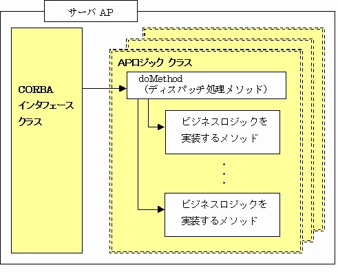 WebOTX画面テンプレートが提供するAPロジッククラスを継承して作成します。doMethod メソッドをオーバライドして、ビジネスロジックを実装する各メソッドを呼び出すためのディスパッチ処理を実装します。 |