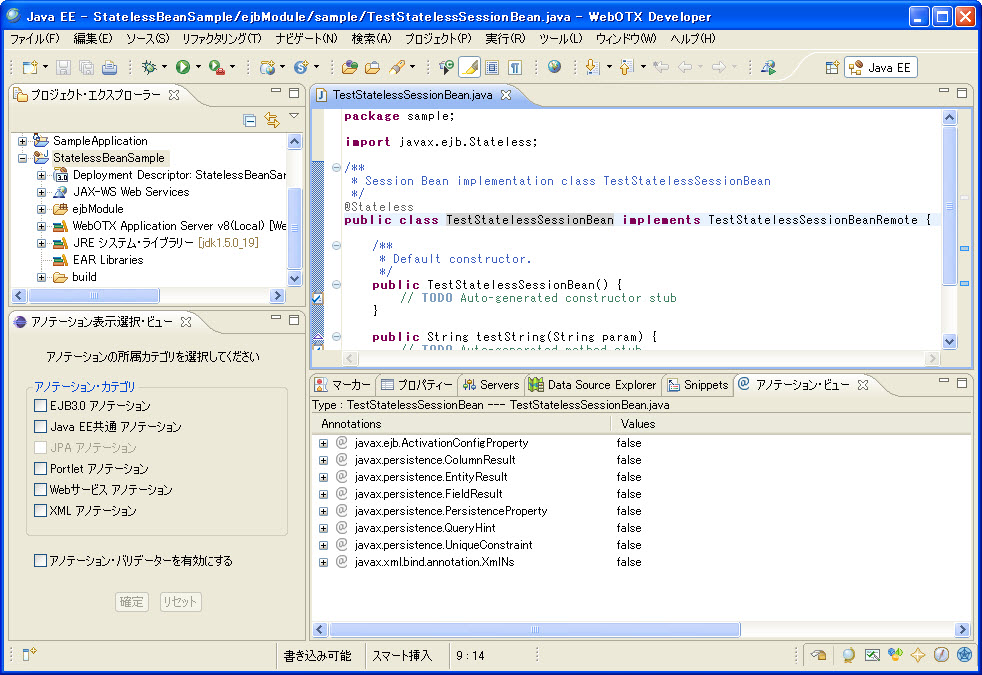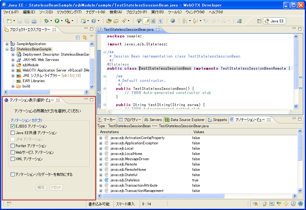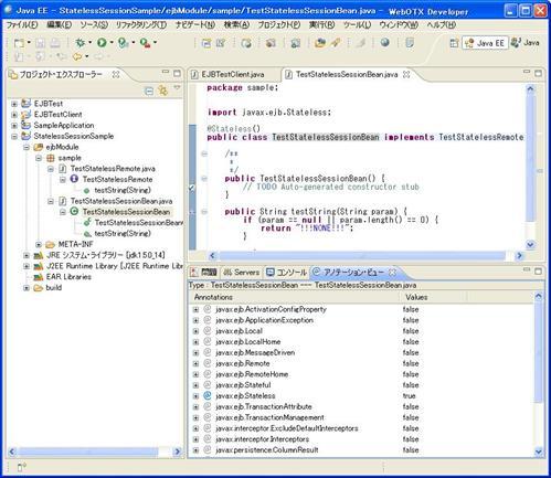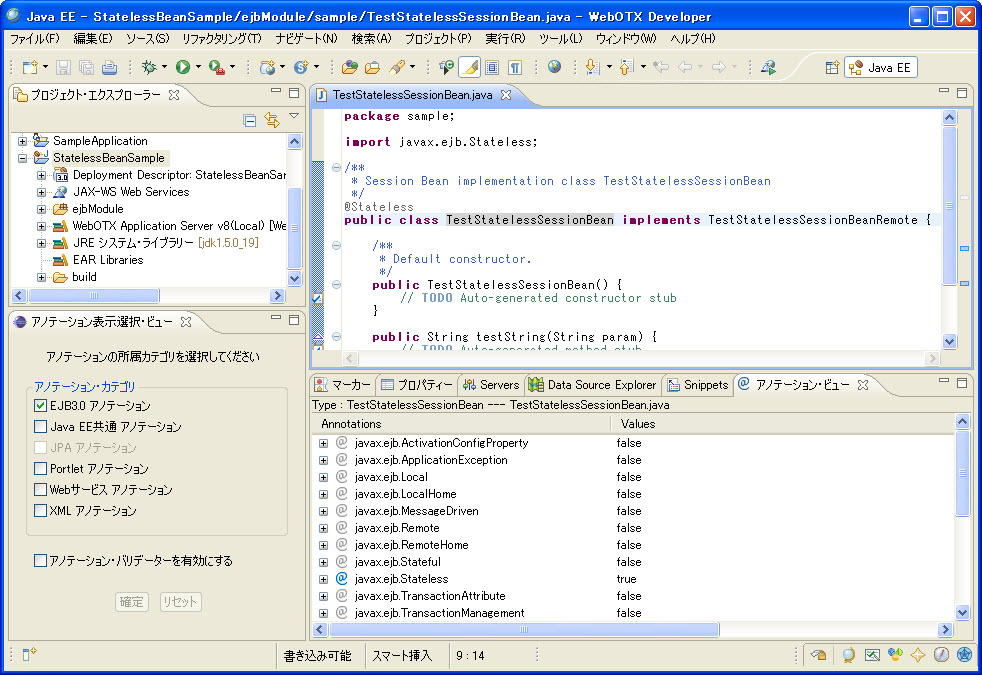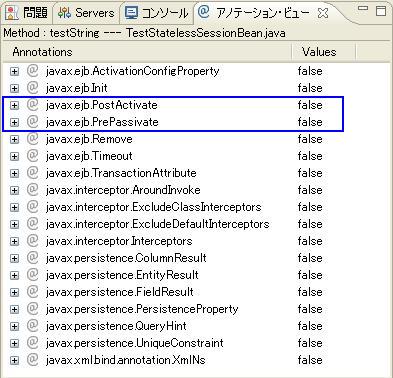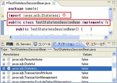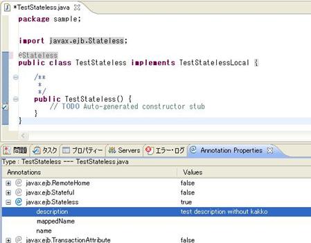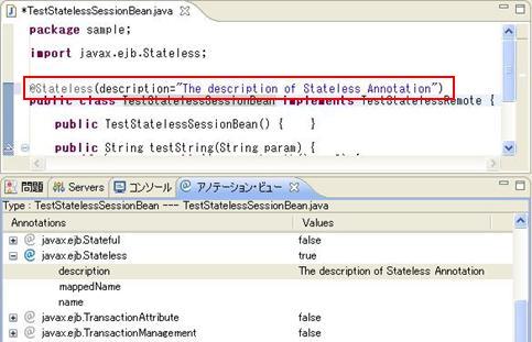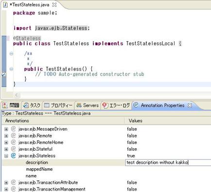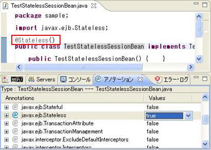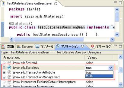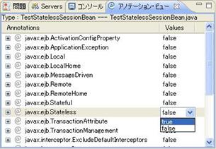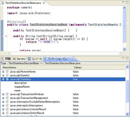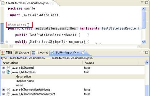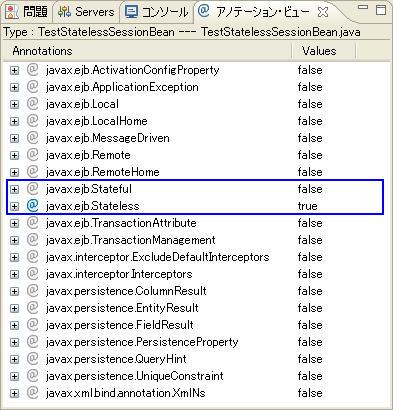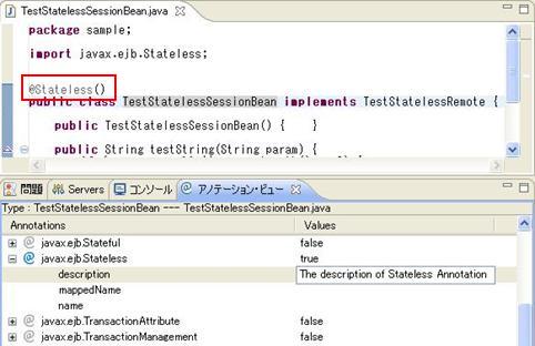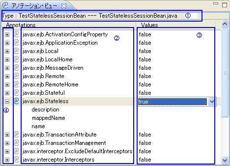 例: Type:TestStatelessSessionBean---TestStatelessSessionBean.java 意味は、該当ビューで表示するのはクラスTestStatelessSessionBeanに付与できるアノテーションです。該当クラスはTestStatelessSessionBean.javaファイルに定義されます。 |