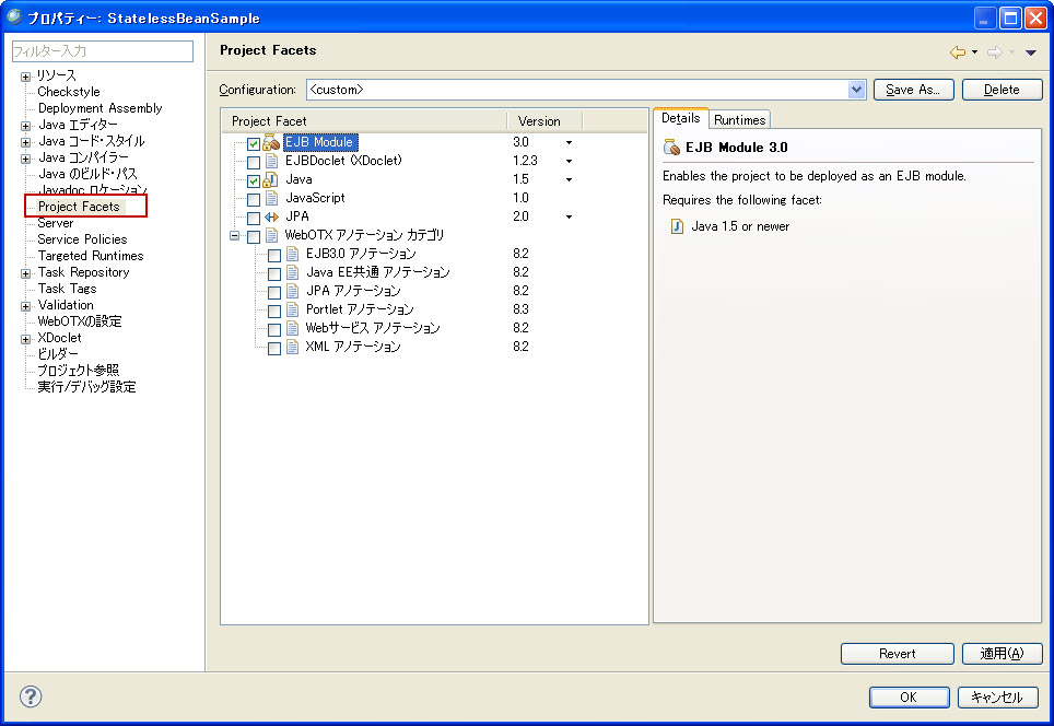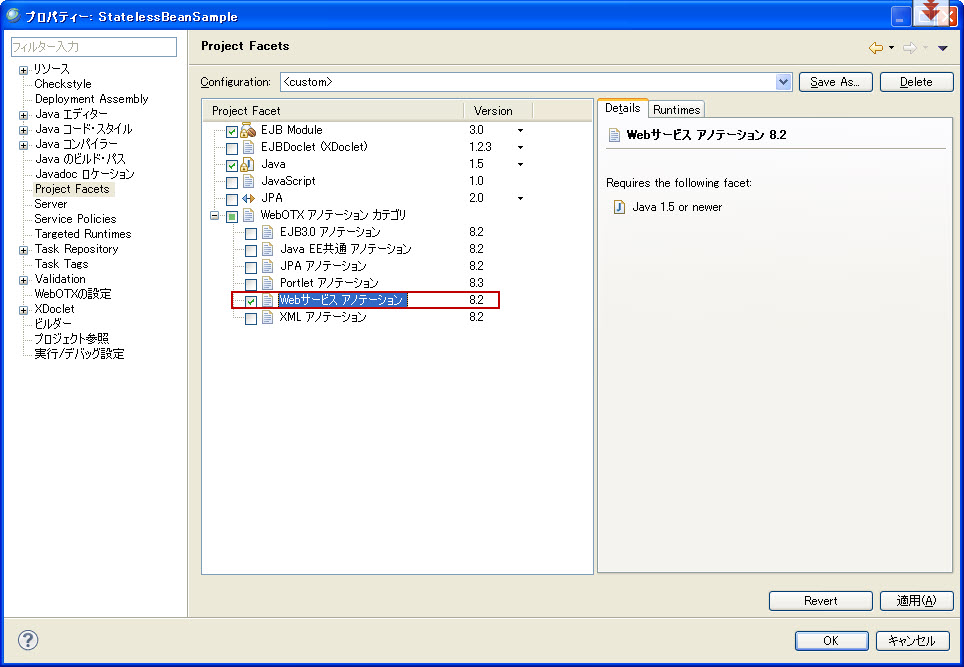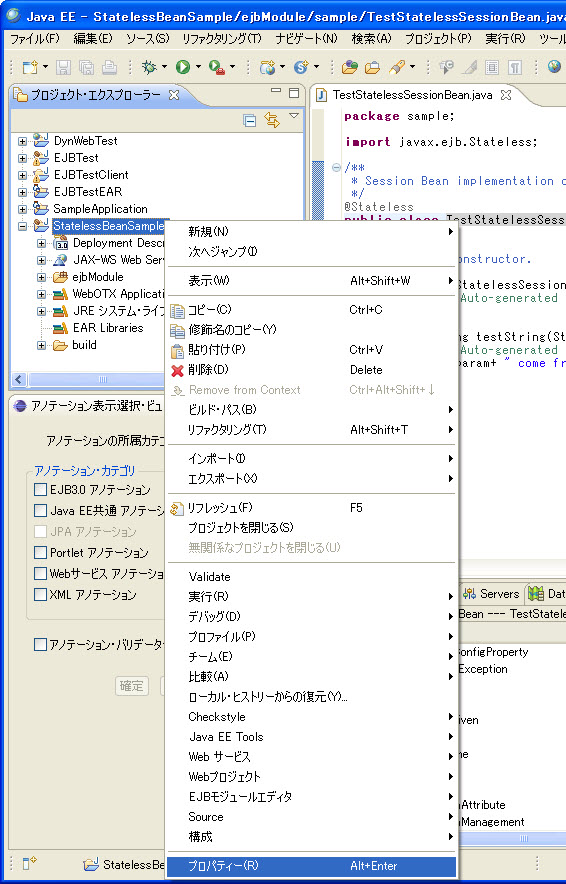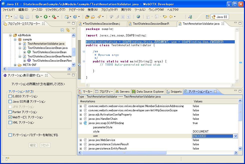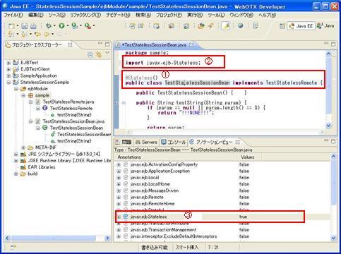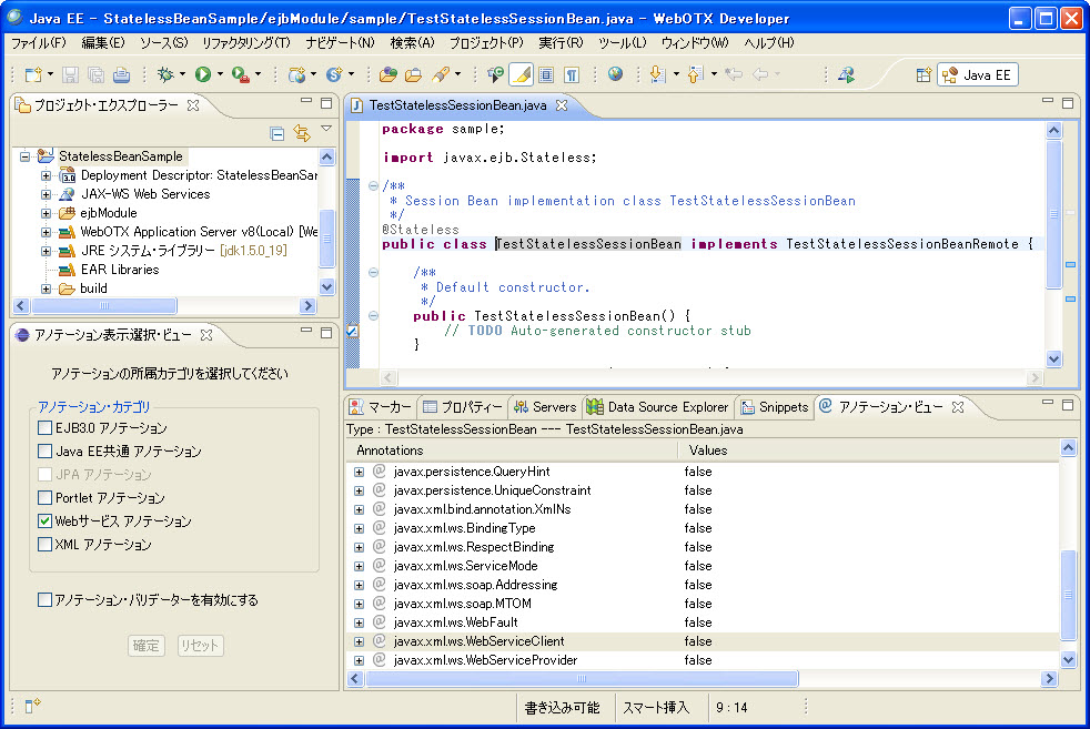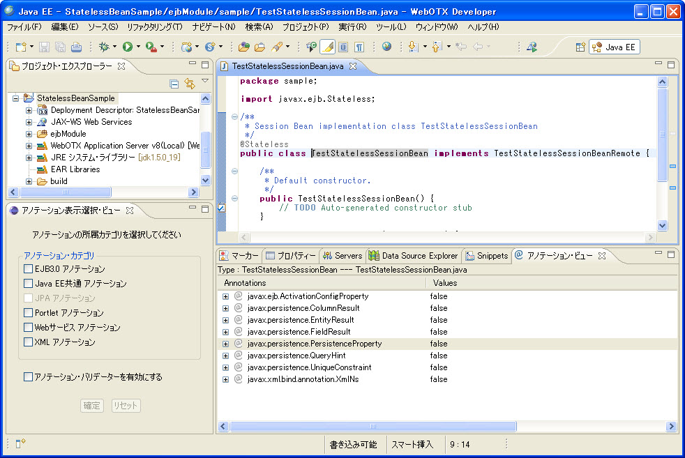 例: Type:TestStatelessSessionBean---TestStatelessSessionBean.java 意味は、該当ビューで表示するのはクラスTestStatelessSessionBeanに付与できるアノテーションです。該当クラスはTestStatelessSessionBean.javaファイルに定義されます。 |