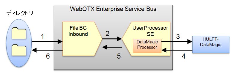 入力ディレクトリからファイルを取得し、HULFT-DataMagicでメッセージ変換を行います。