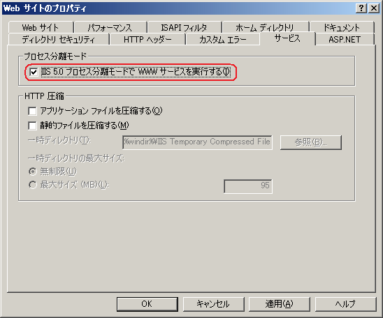 [サービス]タブを選択し、[プロセス分離モード]フレーム内の[IIS 5.0 プロセス分離モードで WWW サービスを実行する]チェックボックスをオンにします。