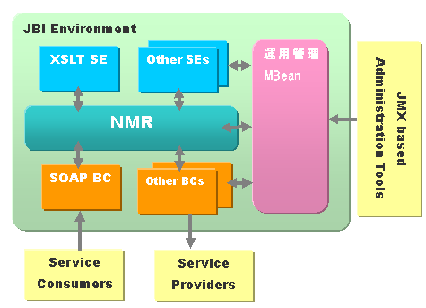 JBIではこれらのMBeanをJMXベースの管理ツールを用いて操作することで運用を行います。