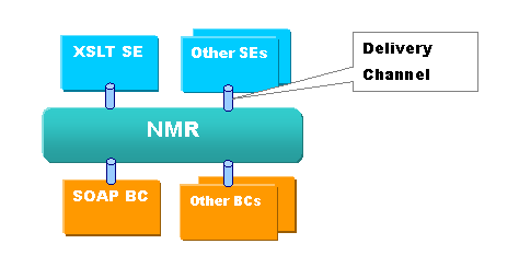 NMRはDelivery Channelと呼ばれる通信路を介して、コンポーネントとメッセージの送受信を行います。また、コンポーネント間の直接の通信は許されておらず、コンポーネントは他のコンポーネントとメッセージを受け渡しする際には、必ずNMRを仲介して行います。また、このときに流れるメッセージがメッセージエクスチェンジ(後述)です。