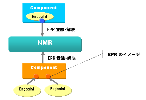 各コンポーネントは外部サービスのエンドポイント参照情報をWSDL2.0定義に基づきEndpoint Reference(以下EPR)として定義し、NMRに操作を行います。EPRに関する操作は以下の2つがあります。