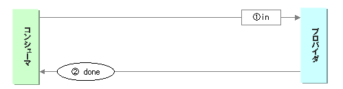 コンシューマの要求(1.in)に対して、プロバイダは完了ステータス(2.done)のみ通知します。