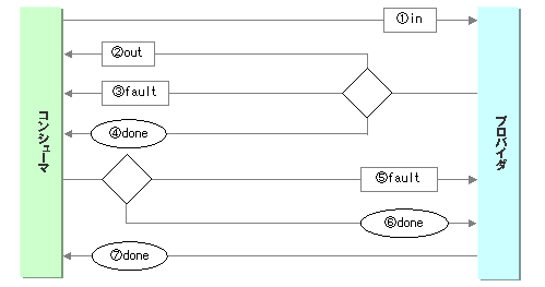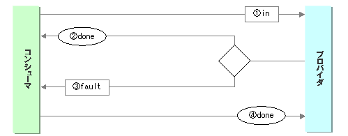 コンシューマの要求(1.in)に対して、プロバイダは受け取ったこと(2.done)のみを通知しますが、プロバイダの処理で異常が発生した場合は異常メッセージ(3.fault)を返します。コンシューマがFaultを受け取った場合は、プロバイダに完了ステータス(4.done)を通知します。