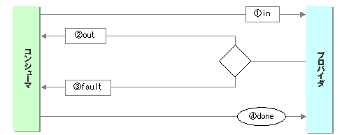 コンシューマの要求(1.in)に対して、プロバイダは応答(2.out)を返します。プロバイダの処理で異常が発生した場合は異常メッセージ(3.fault)を返します。コンシューマは、プロバイダにメッセージを(4.done)完了ステータスを通知します。